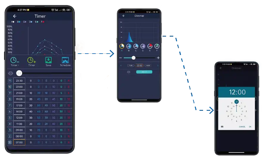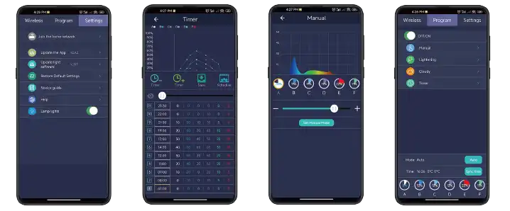 This reef tank light features a programmable timer that can be controlled either through a mobile app or manually via the onboard display. Each timing segment and individual channel’s brightness is fully customizable to meet specific needs. The system supports adjustable timer groups, allowing up to 24 programmable segments for ultimate lighting control.
